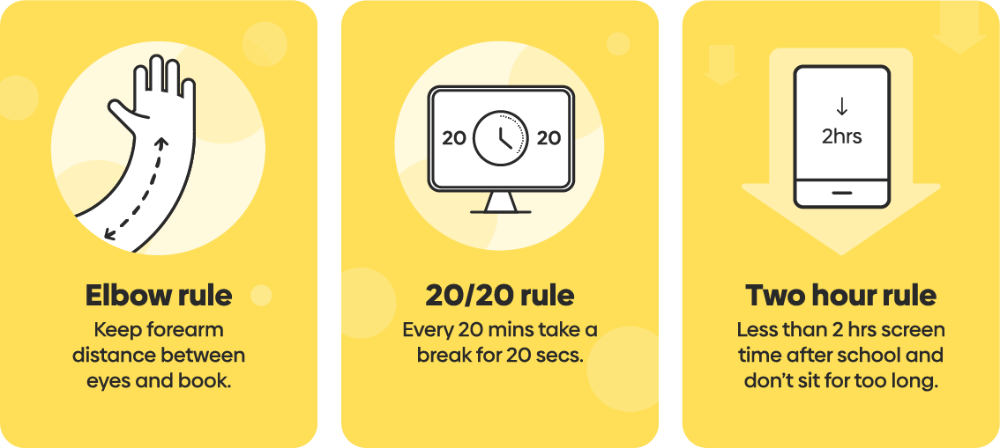 1. The elbow rule: keep an elbow-to-hand distance away from books and screens to avoid them being too close to the eyes.