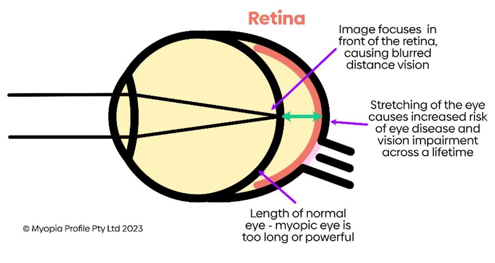 Myopia, often called ‘short-sightedness’ or ‘near-sightedness’, is a type of refractive error that affects how clearly things in the distance are seen. The worse the myopia, the harder it is to perceive distant objects, leading to behaviours such as squinting, leaning or moving closer, and complaining of eye strain or tired eyes after extended periods of far viewing.