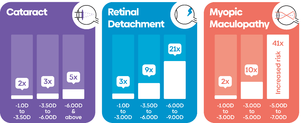 For example, those with high myopia are 13-times more likely to develop retinal detachment compared to those without, but even mild myopia is at 3-fold the risk.17