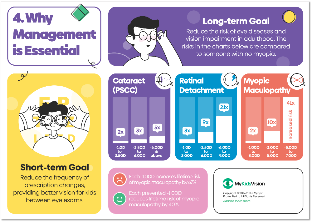 Your child’s eye care practitioner or eye doctor (optician, optometrist or ophthalmologist) may use the following Infographic from MyopiaProfile.com to summarize the ‘why’ of myopia management, including the short-term and long-term goals, and the lifetime eye health risks which come with increasing levels of myopia. We developed the Infographics because using pictures in health communications has been shown to improve learning and application of advice between health professionals, patients and their parents or carers.15