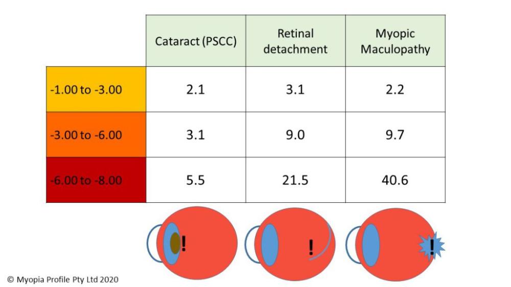 A table showing the increased risk of eye diseases with higher levels of myopia.8 The risk of these eye diseases for someone who is not myopic is ‘1’ – these are odds ratios, indicating the multiple of increased risk for that eye disease by the level of myopia. For example, a -1.00D myope has a 2.1x increased risk of cataract and a 3.1 x increased risk of retinal detachment compared to someone who is not myopic.