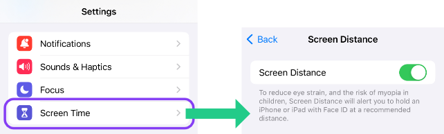Children are at greater risk of developing myopia if they view books or screens closer than 25cm, and continuously without taking a break for 45 minutes or more.1 The new iOS Screen Distance setting can encourage kids to avoid these very close viewing distances which can be harmful to vision and eye health.